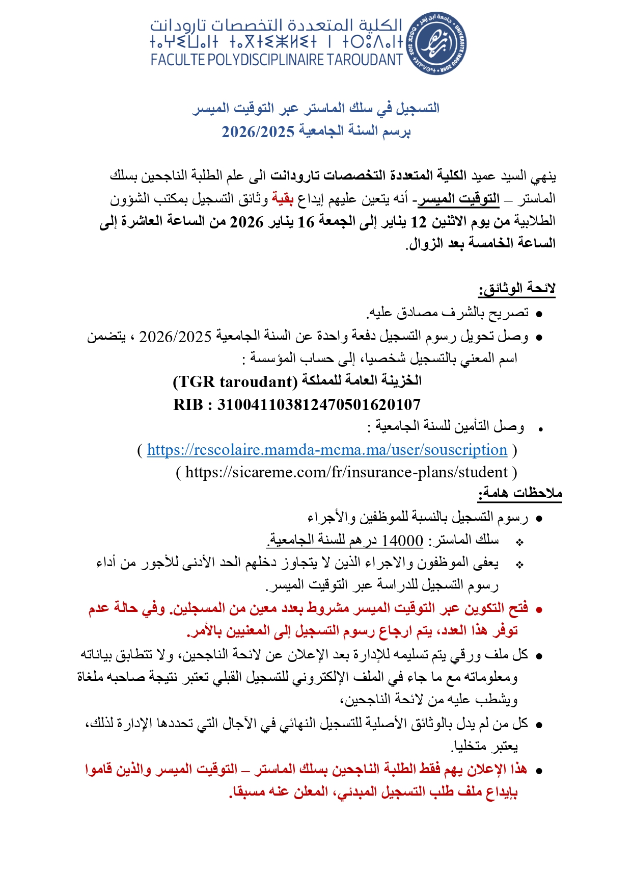 Master: COMMUNICATION, TRANSITION NUMERIQUE ET DEVELOPPEMNT La liste des admis de la liste d'attente Date d'inscription: : Lundi 12 Janvier 2026 de 10h à 16h. Pièces à fournir: Attestation originale du...