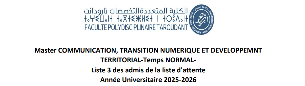 Master: COMMUNICATION, TRANSITION NUMERIQUE ET DEVELOPPEMNT TERRITORIAL La liste 3 des admis de la liste d'attente Date d'inscription: : Vendredi 23 Janvier 2026 de 10h à 14h Pièces à fournir: Attestation...