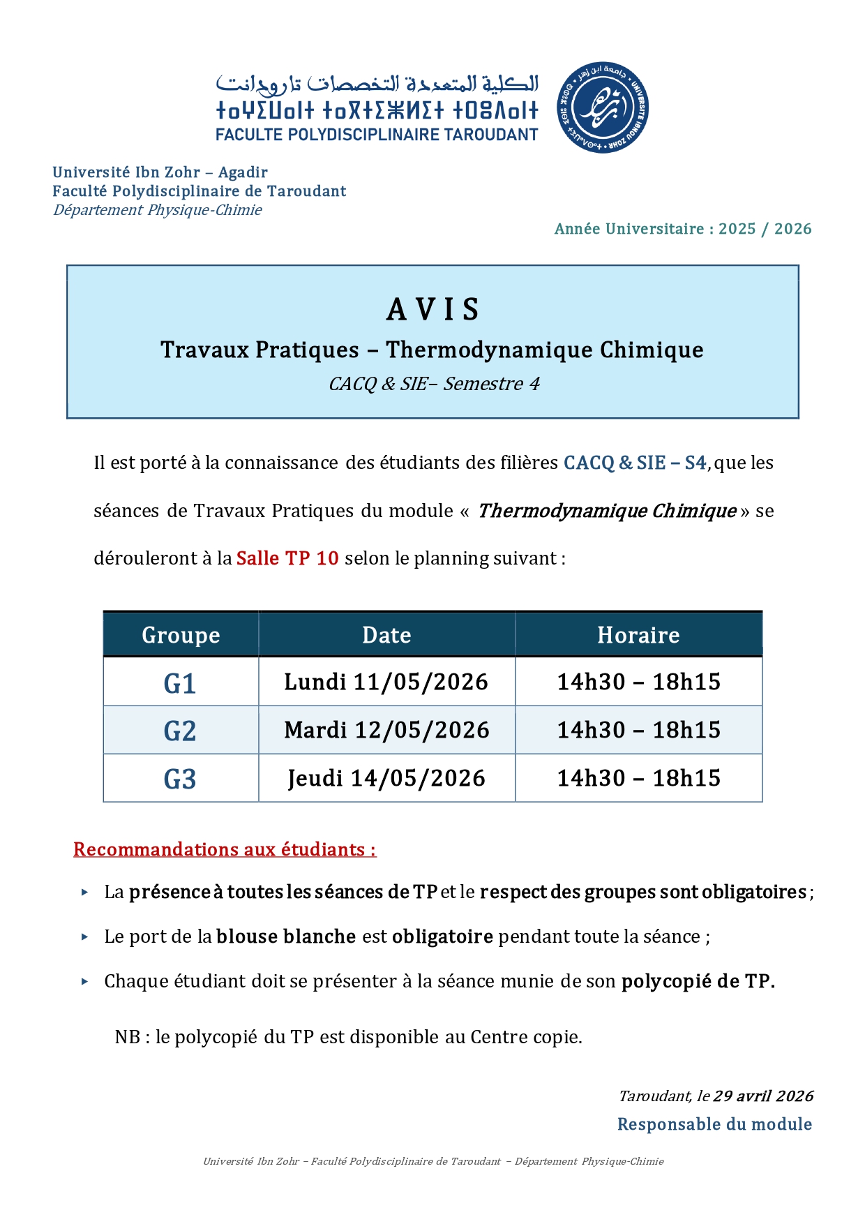 Avis TP – Thermodynamique Chimique CACQ & SIE– Semestre 4