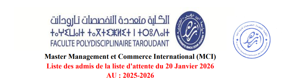 Master: Management et Commerce International (MCI) La liste 3 des admis de la liste d'attente_Temps aménagé Date d'inscription: : Mardi 20 Janvier 2026 Pièces à fournir: Attestation originale du baccalauréat ...