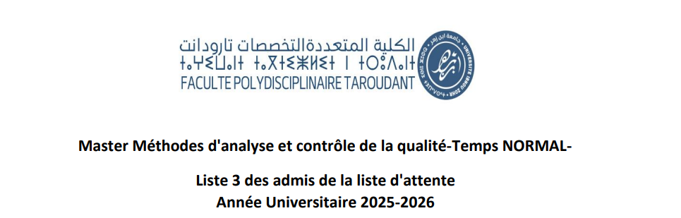 Master: Méthodes d'Analyse et Contrôle de la qualité La liste 3 des admis de la liste d'attente Date d'inscription: : Mardi 20 Janvier 2026 de 10h à 14h Pièces à fournir: ...