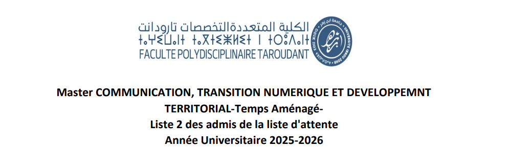 Master: COMMUNICATION, TRANSITION NUMERIQUE ET DEVELOPPEMNT TERRITORIAL La liste 2 des admis de la liste d'attente_Temps aménagé Date d'inscription: : Mardi 20 et Mercredi 21 Janvier 2026 Pièces à fournir: Attestation...