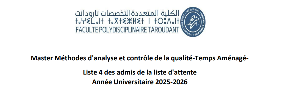 Master: Méthodes d'Analyse et Contrôle de la qualité(MACQ) La liste 4 des admis de la liste d'attente_Temps aménagé Date d'inscription: : Jeudi 26 Février 2026 Pièces à fournir: Attestation originale...
