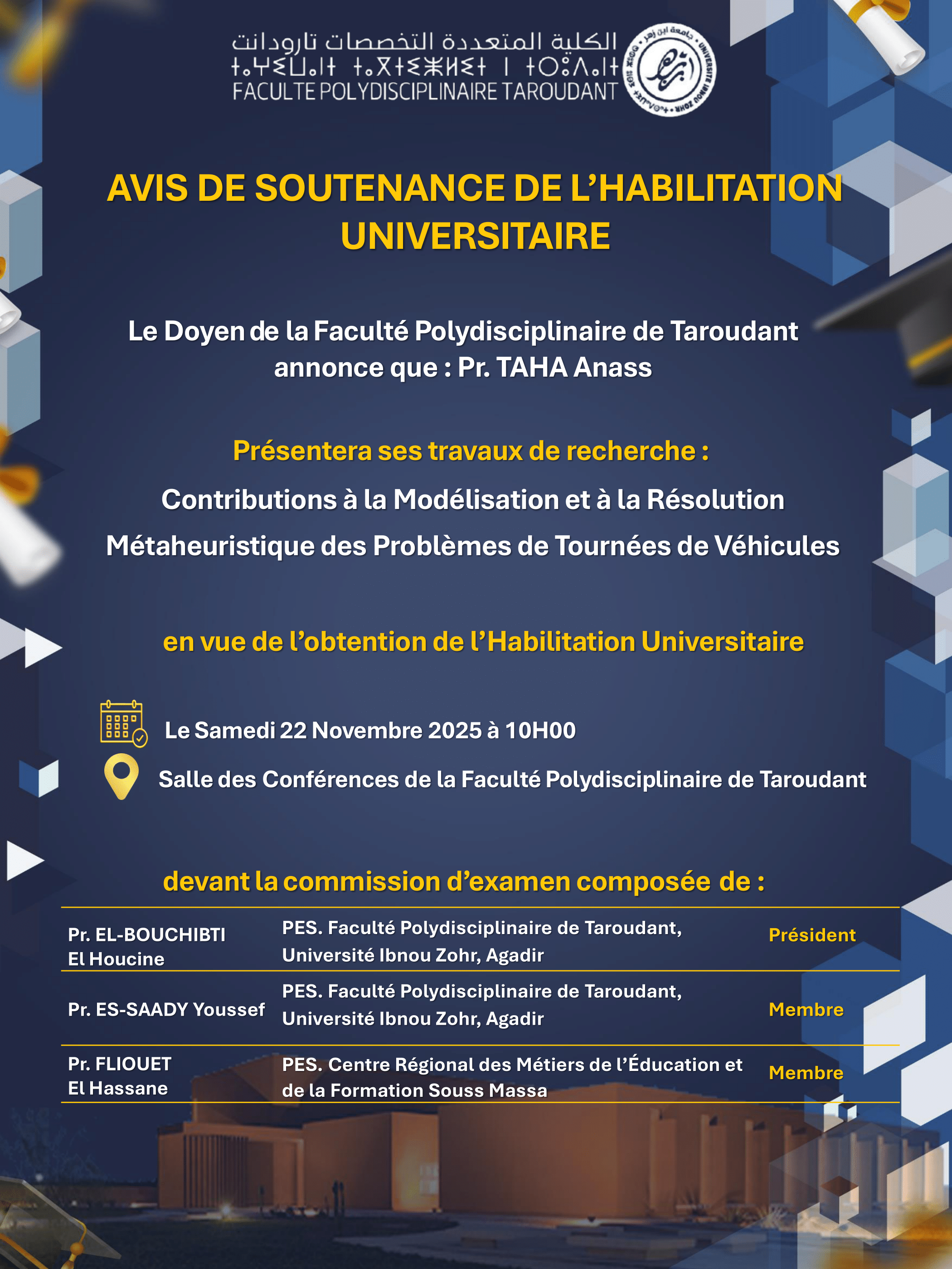 Habilitation Universitaire Professeur TAHA Anass Samedi 22 Novembre 2025 à la salle des Conférences de la Faculté Polydisciplinaire de Taroudant Avis...