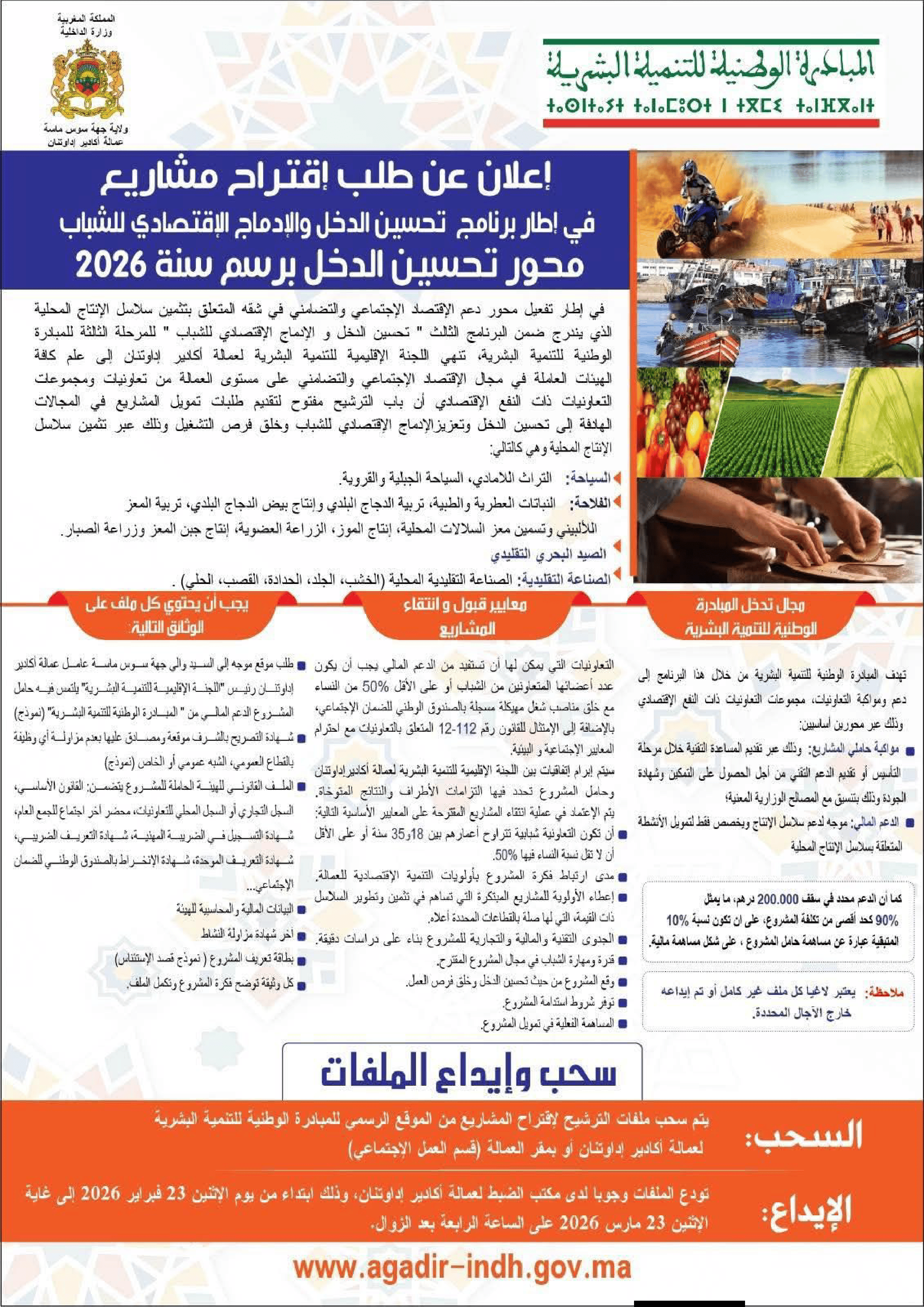 إعلان عن طلب اقتراح مشاريع في إطار برنامج تحسين الدخل والإدماج الاقتصادي للشباب محور تحسين الدخل برسم سنة 2026 | INDH, Préfecture d’Agadir ida Outanane...