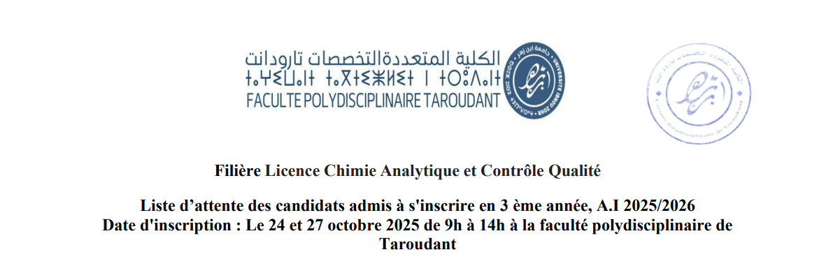 Licence Chimie Analytique et Contrôle Qualité - 2025/2026 Liste d'attente des candidats admis à s'inscrire en 3ème année au titre de l'année universitaire 2025/2026 ...