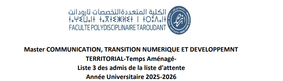 Master: COMMUNICATION, TRANSITION NUMERIQUE ET DEVELOPPEMNT TERRITORIAL La liste 3 des admis de la liste d'attente Date d'inscription: : Vendredi 23 Janvier 2026 de 10h à 14h Pièces à fournir: Attestation...