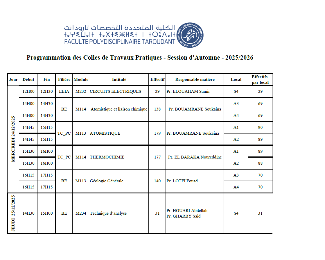 Programmation des Colles de Travaux Pratiques - Session Automne - 2025/2026